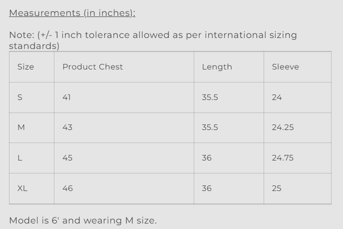Note: (+/- 1 inch tolerance allowed as per international sizing standards)
