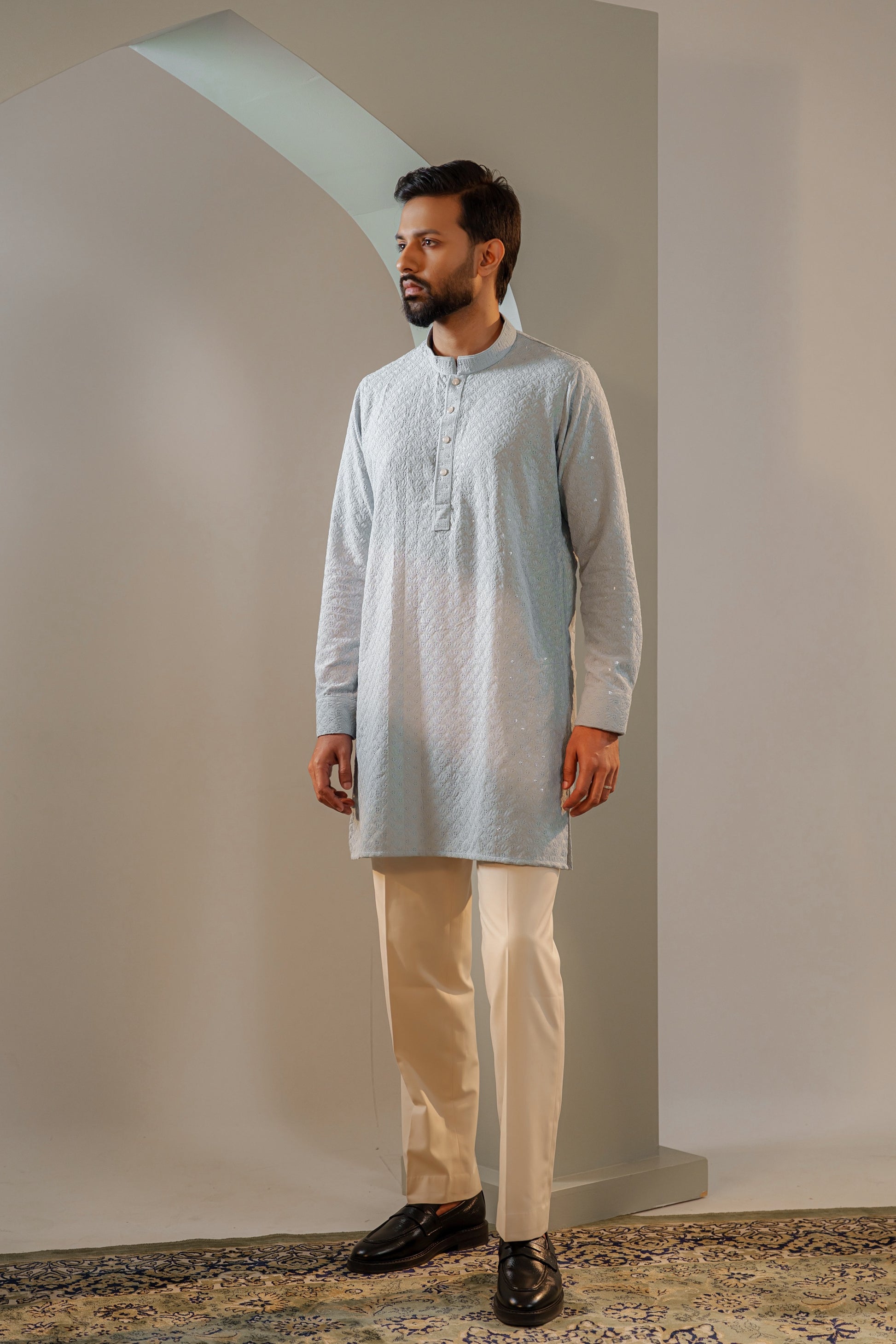 The Ayaaz Embroidered Panjabi in Steel Blue blends contemporary style with traditional elegance. Featuring intricate embroidery on the collar and button plate, this piece stands out with its refined detailing. The cool steel blue shade adds a modern edge, making it a perfect choice for celebrations and special occasions. Crafted from breathable cotton and designed with a short-length silhouette, this Panjabi ensures both style and ease of movement.