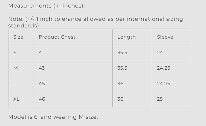Note: (+/- 1 inch tolerance allowed as per international sizing standards)