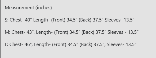S: Chest- 40” Length- (Front) 34.5” (Back) 37.5” Sleeves- 13.5”