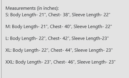M: Body Length- 21", Chest- 40", Sleeve Length- 22"