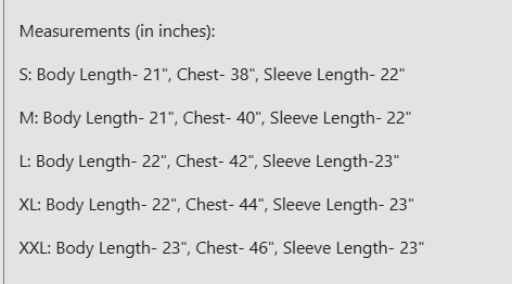 M: Body Length- 21", Chest- 40", Sleeve Length- 22"