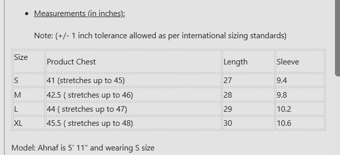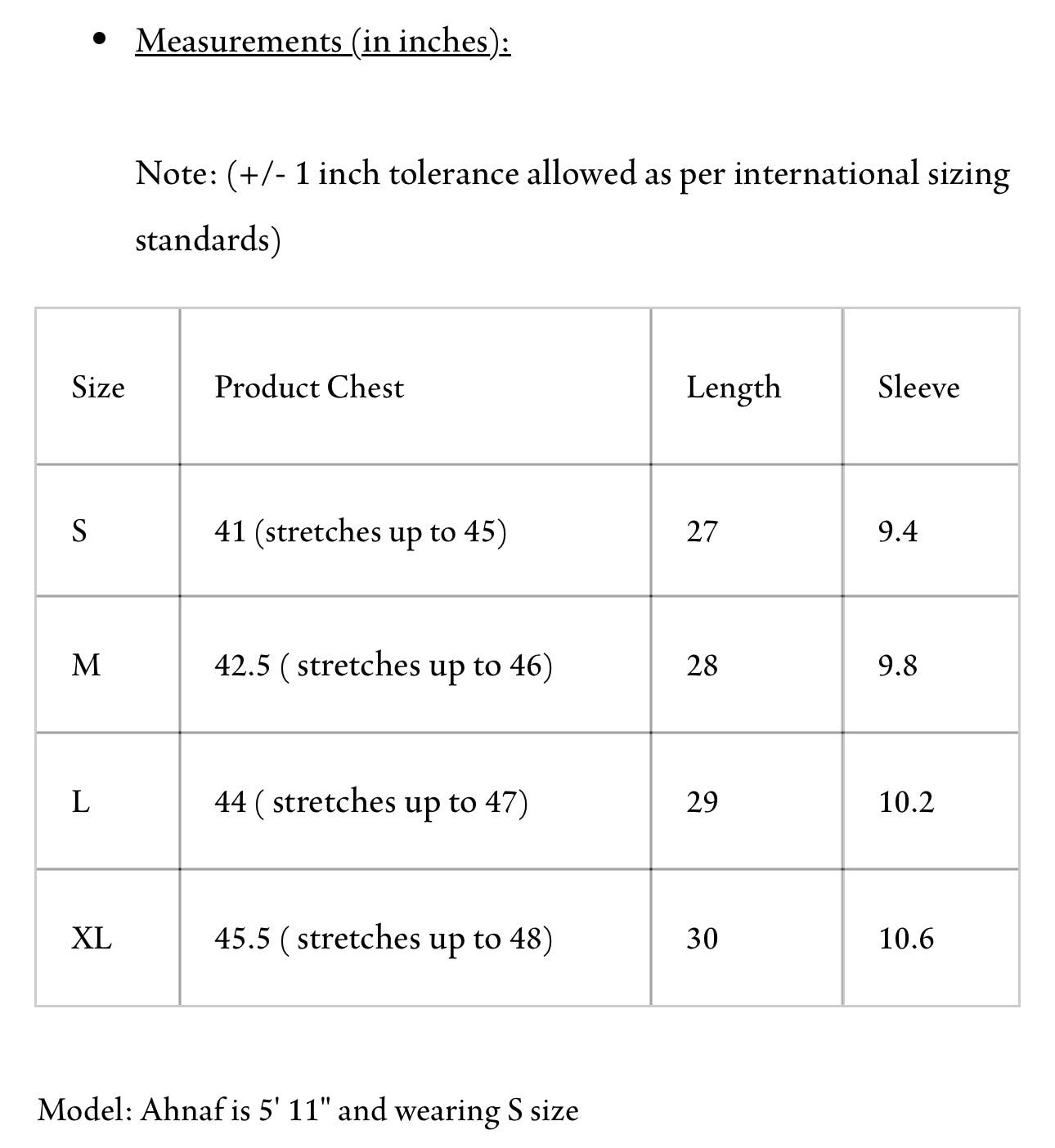 Note: (+/- 1 inch tolerance allowed as per international sizing standards)
