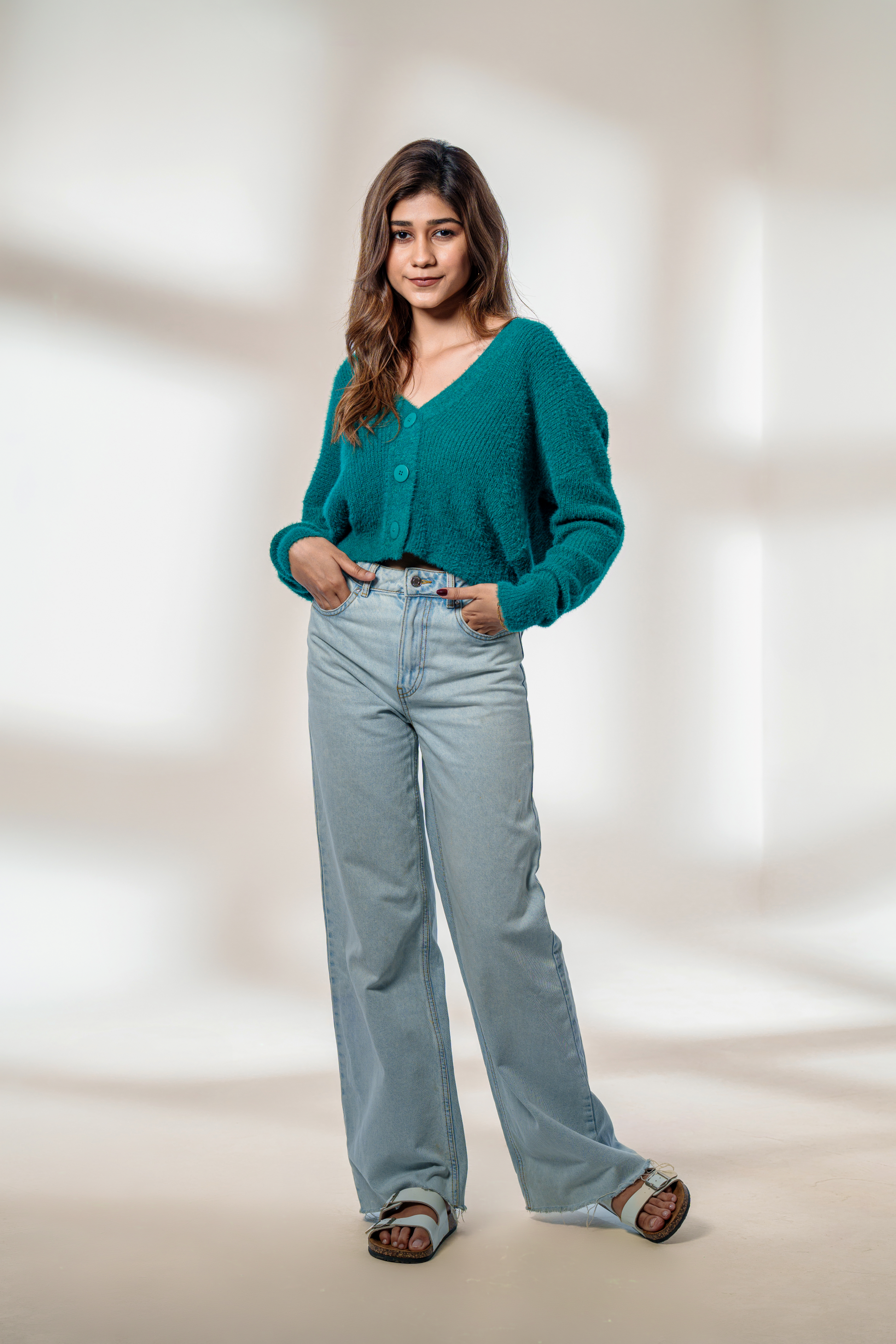 Wrap yourself in coziness with our trendy Fuzzy Teal Oversized Cardigan. The gorgeous colour, coupled with its irresistibly soft texture and adorned with big buttons, makes it a must-have for your winter wardrobe.