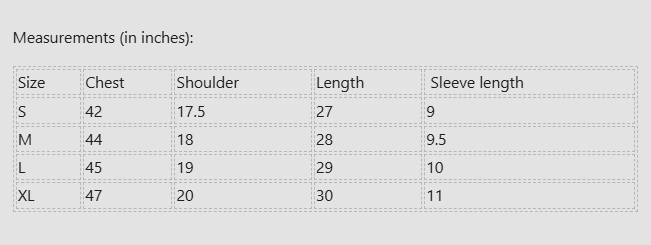 Size Chest Shoulder Length  Sleeve length