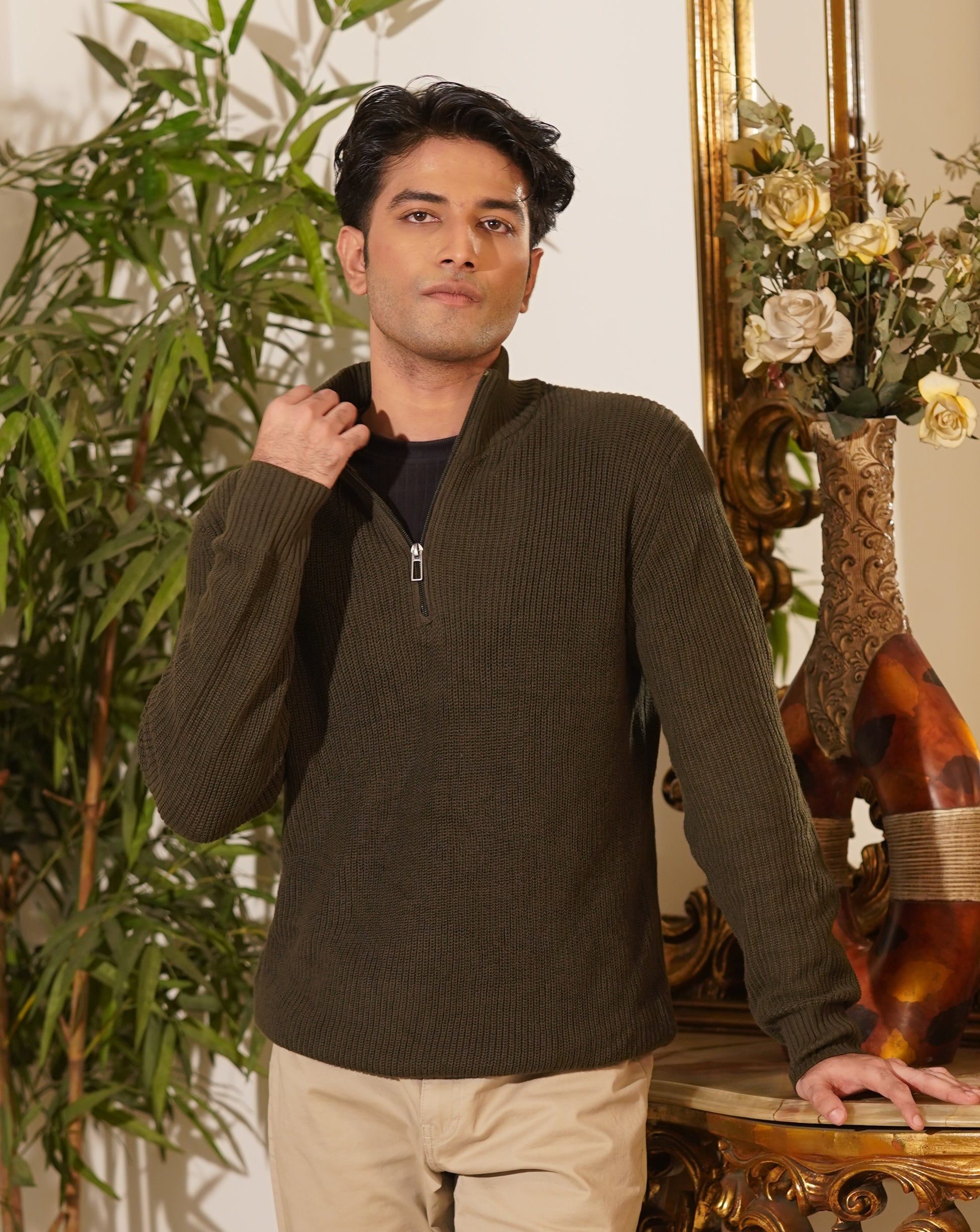 Green Mock Neck Zip Collar Sweater brings together comfort and style with its 100% cotton build and rich green tone. Featuring a premium YKK zipper and textured knit, it’s perfect for versatile layering — whether paired with a tee, shirt or worn under an outer layer.