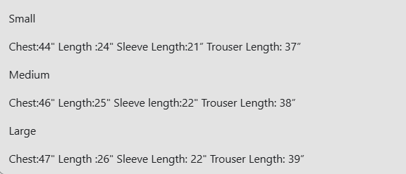 Chest:44" Length :24" Sleeve Length:21” Trouser Length: 37”