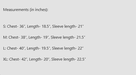 M: Chest- 38”, Length- 19”, Sleeve length- 21.5”