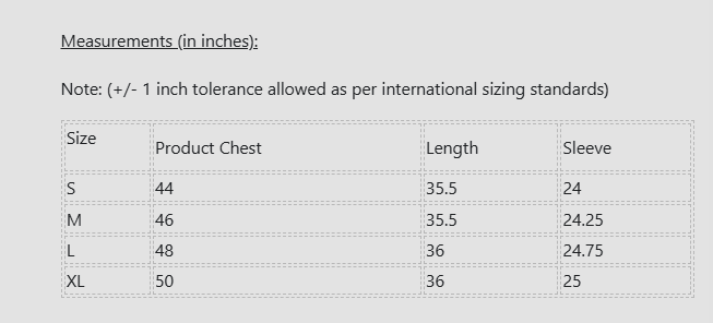 Note: (+/- 1 inch tolerance allowed as per international sizing standards)