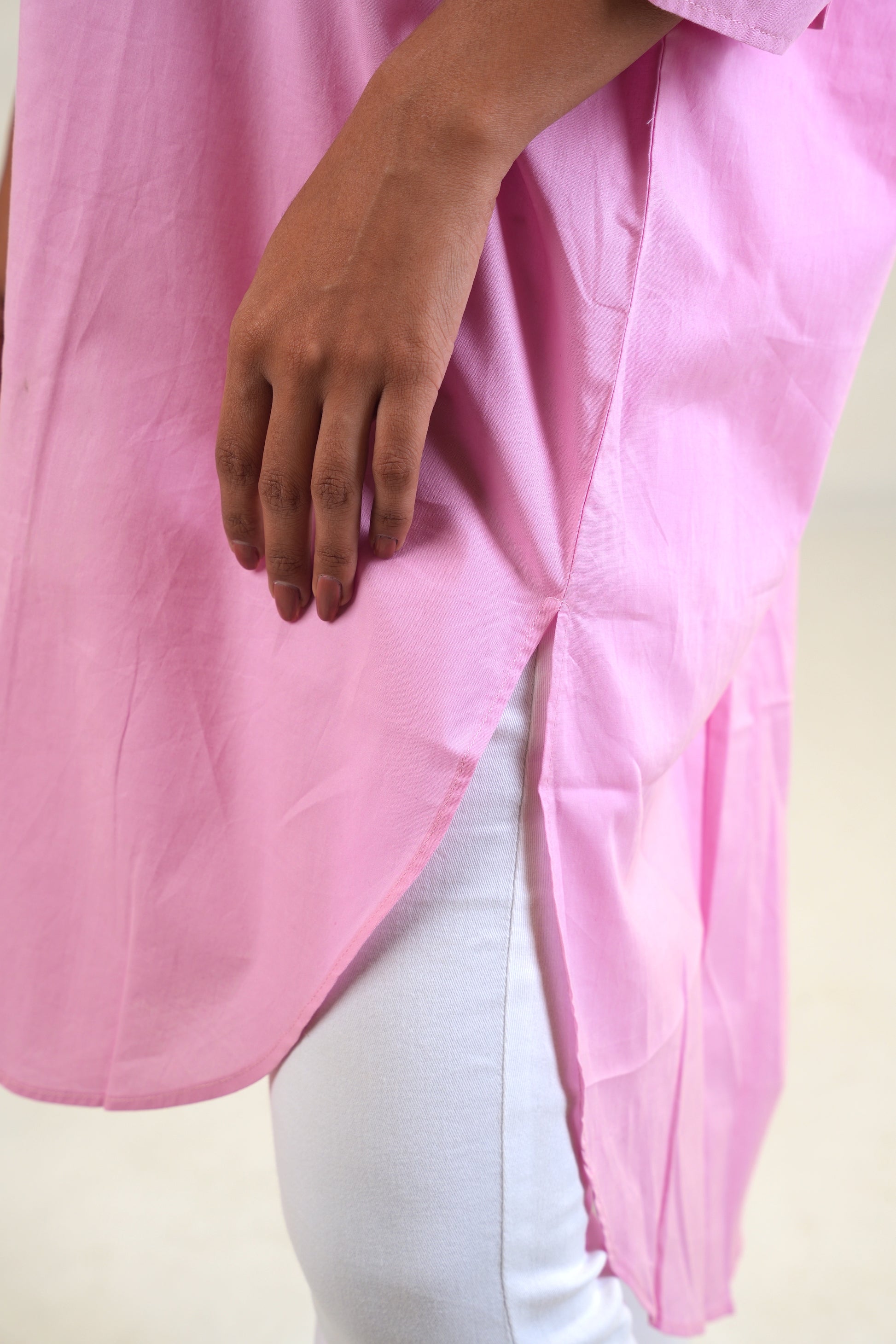 Introducing our Light Pink Oversized Poplin Top – a versatile and chic addition to your wardrobe! This delightful top features cuffed sleeves, side slits with a high-low cut, a button-up front, smart collar, and a sweet pink hue.