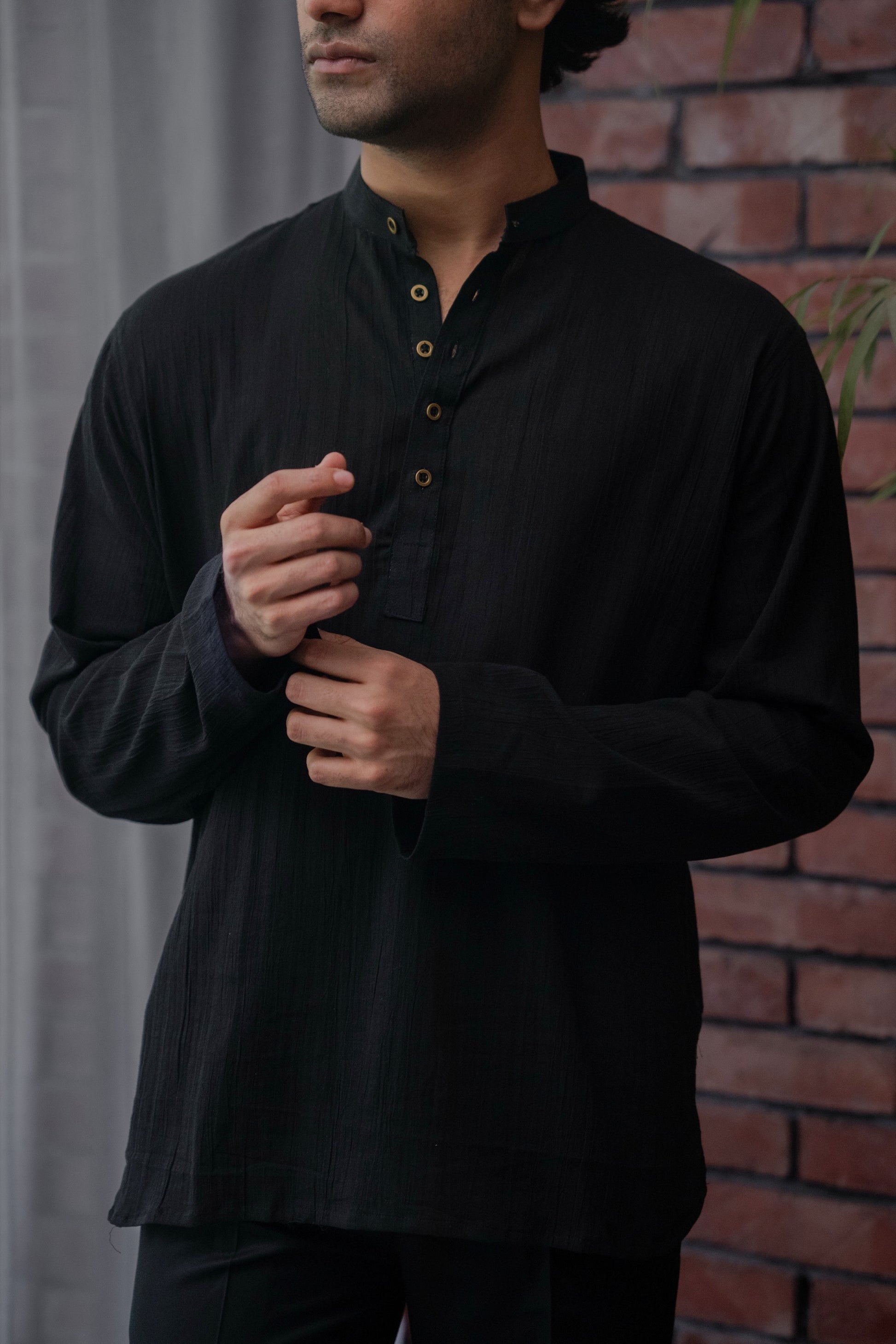 Naael in Black redefines contemporary tradition through texture and proportion. The crinkled cotton-blend fabric lends depth to its dark palette, while a refined collar and curved hemline enhance its poised silhouette. Tailored in a regular fit, it balances familiarity with modern form.