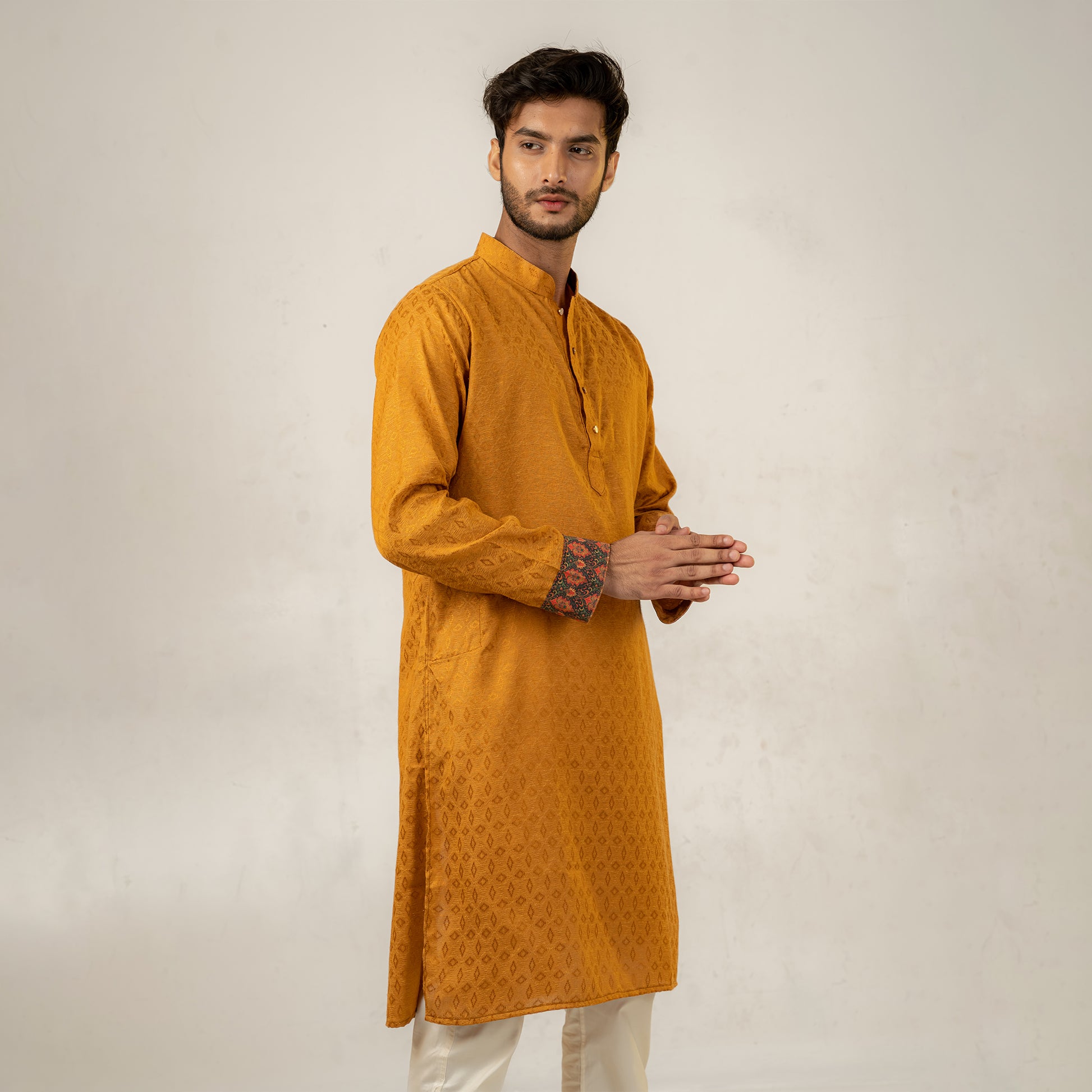 The Nahyan Jacquard Kurta comprises quality jacquard fabrics with a rich luster, beautiful contrasting printed linings on the inside and gorgeous regal tones to round off the look.