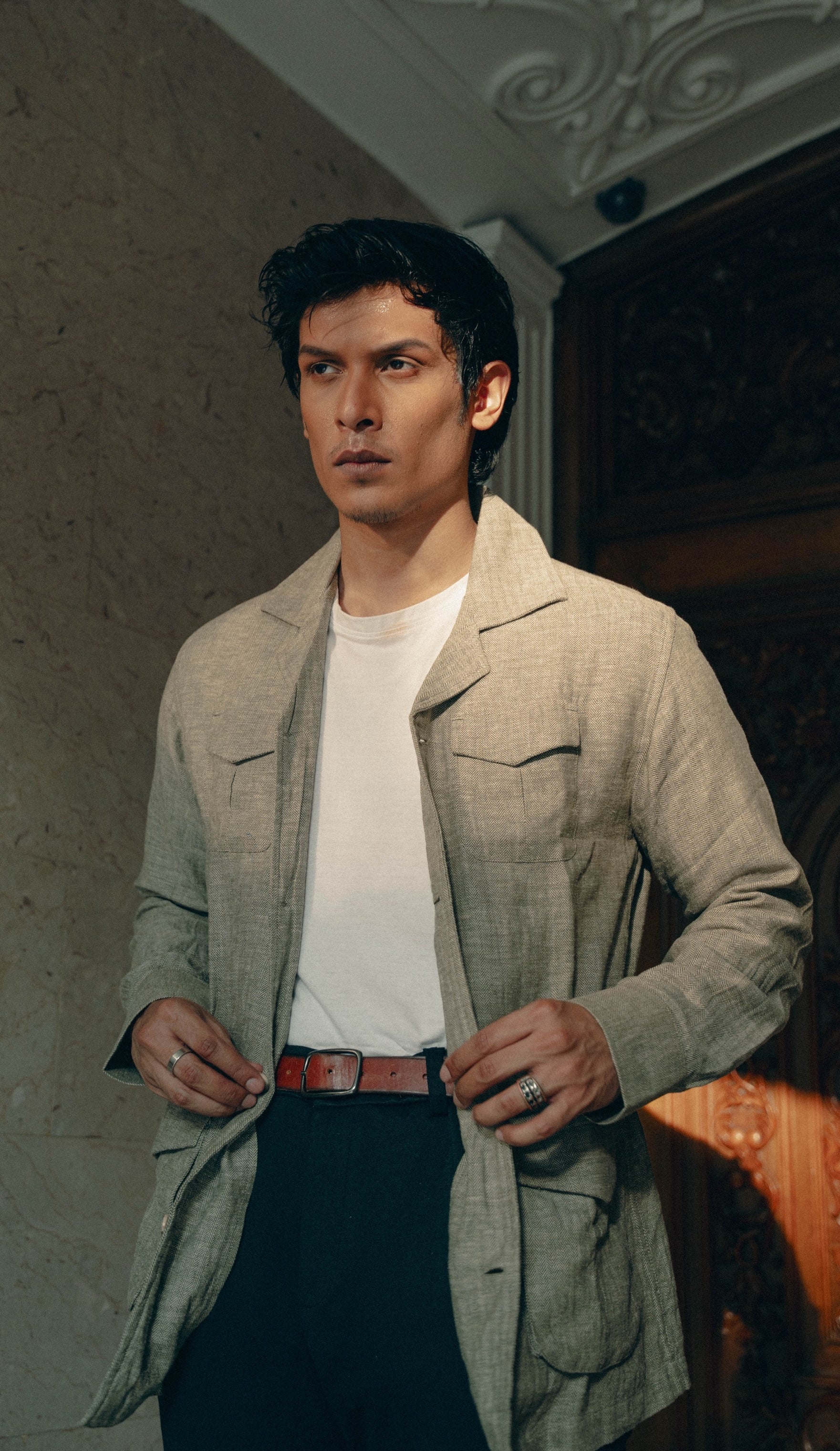 Designed as the ultimate travel companion, the Olive Herringbone Travel Safari Jacket blends function with sophisticated style. Crafted from a beautiful heavyweight cotton fabric for a structured drape, it features a drawstring for adjustable fit and secure flap pockets to hold essentials like AirPods or passports. Relaxed and airy, it’s perfect for journeys of all kinds.