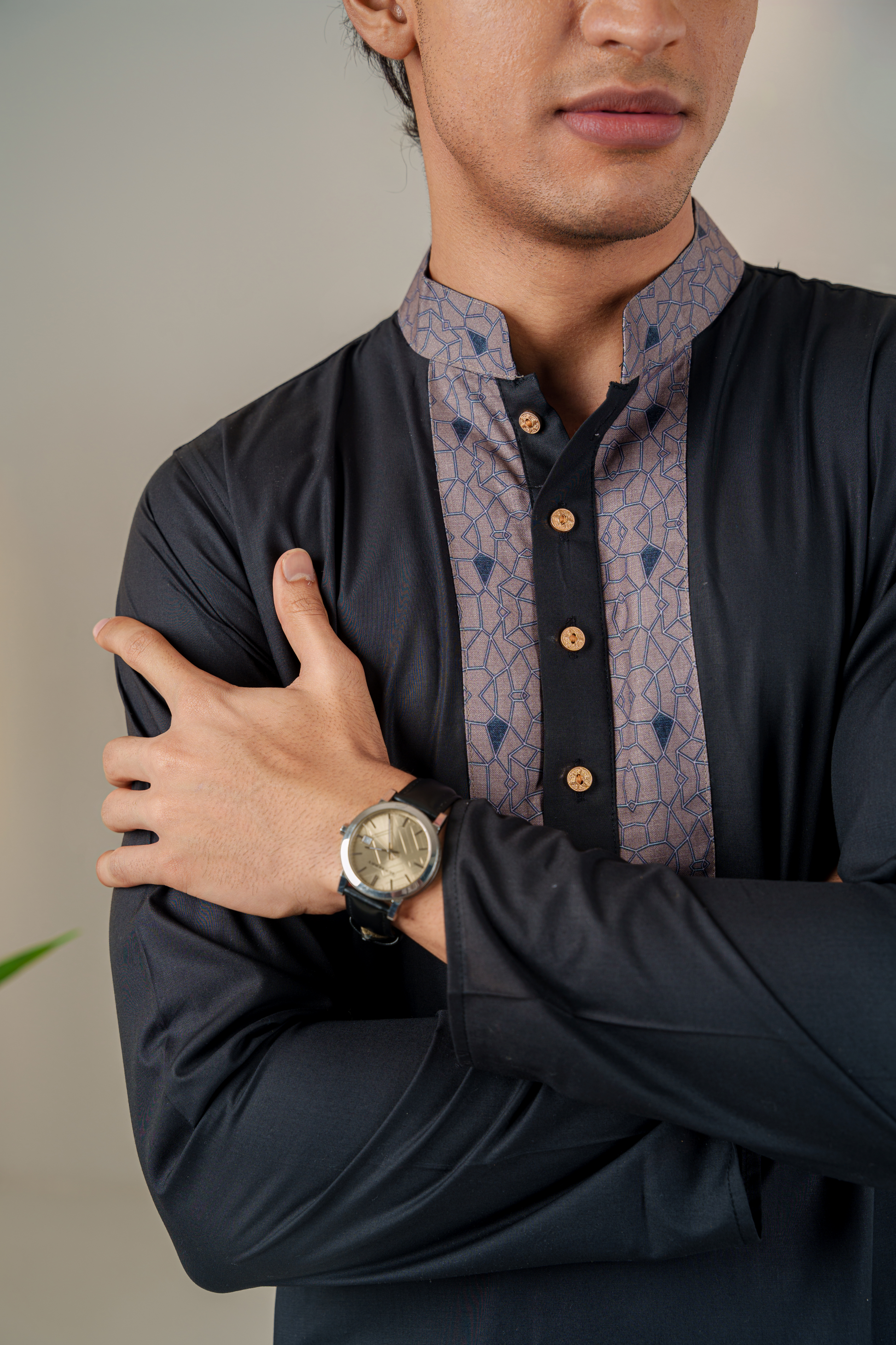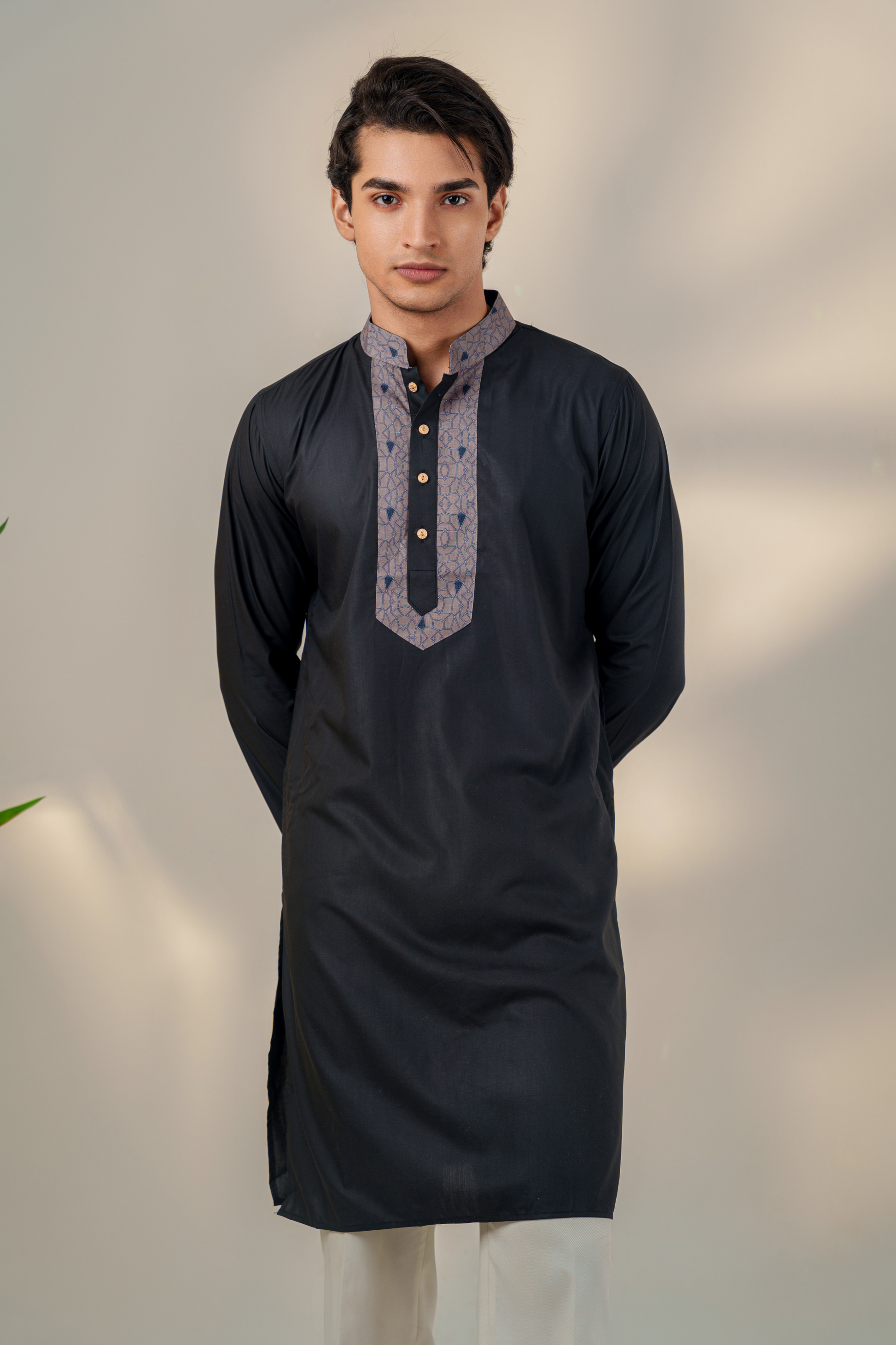 Introducing our sleek and sophisticated Jet Black Geo Punjabi with cuffs and collar featuring a modern geometric pattern. Whether worn for formal occasions or casual gatherings, this Punjabi effortlessly embodies sharp elegance and urban chic