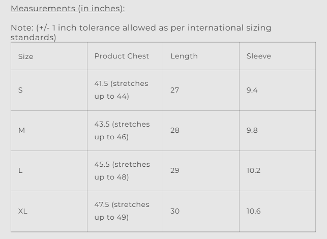 Note: (+/- 1 inch tolerance allowed as per international sizing standards)