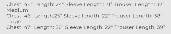 Chest: 46" Length:25" Sleeve length: 22" Trouser Length: 38”